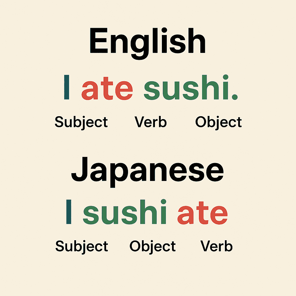 English primarily uses an SVO (Subject-Verb-Object) sentence structure, while Japanese employs an SOV (Subject-Object-Verb) sentence structure. Let’s explore what this means and how the two are different through the graphic below.