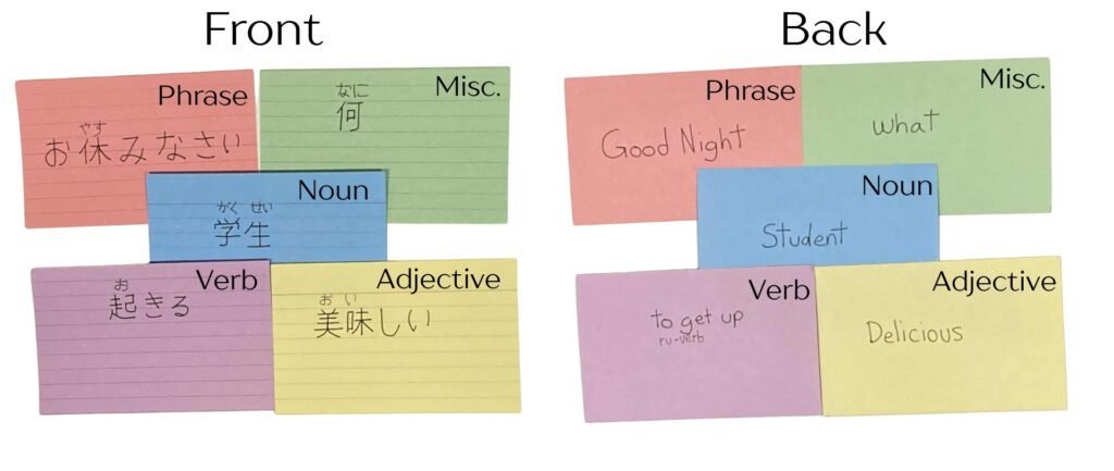 I also realized I still had not studied Katakana, so I modified my flashcards to include Katakana beside the Hiragana. I continued to use these for learning and review.